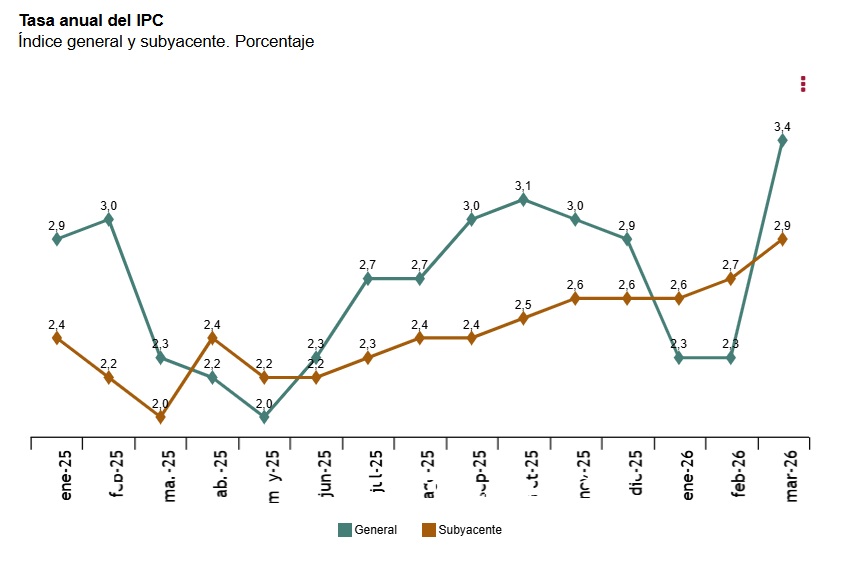 La tasa de variación anual del IPC del mes de marzo se situó en el 3,4%, más de un punto por encima de la registrada en febrero. La tasa anual de la inflación subyacente aumentó dos décimas, hasta el 2,9%. La variación mensual del índice general fue del 1,2%.