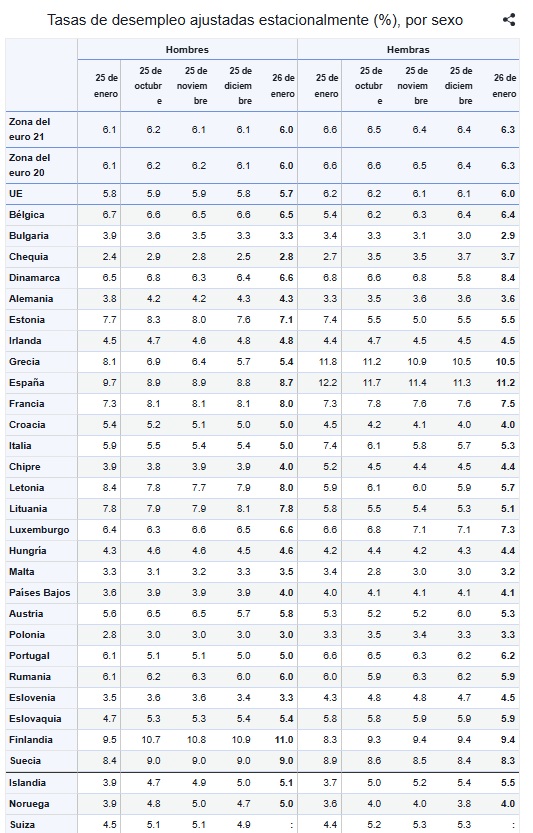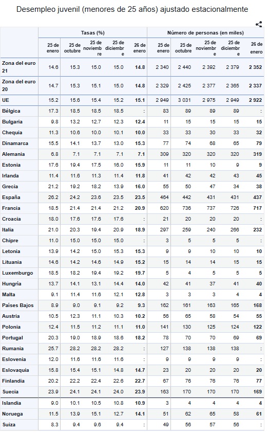 En cifras absolutas, estos datos apuntan a que 12,9 millones de ciudadanos de la UE carecían de un puesto de trabajo en enero, de los cuales 10,7 millones viven en países de la zona euro.