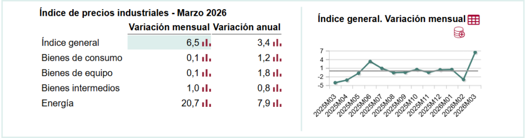 La tasa anual del índice de precios industriales (IPRI) repuntó al 3,4 % en marzo, cuando un mes antes caía el 6,9 %, una escalada que responde al encarecimiento de la energía provocado por el estallido de la guerra en Oriente Medio. Esa cambio radical en la evolución de la inflación industrial supone un duro golpe para la competitividad de las empresas españolas.