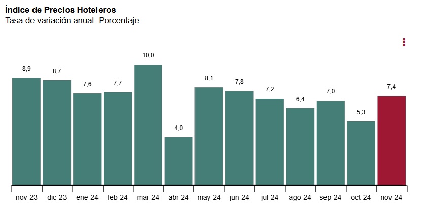 Los precios de los hoteles subieron un 7,4% en noviembre respecto al mismo mes de 2023, frente a una inflación general en ese mes del 2,4%. El precio medio de una habitación supera ya los 113 euros por noche, según el Instituto Nacional de Estadística (INE).