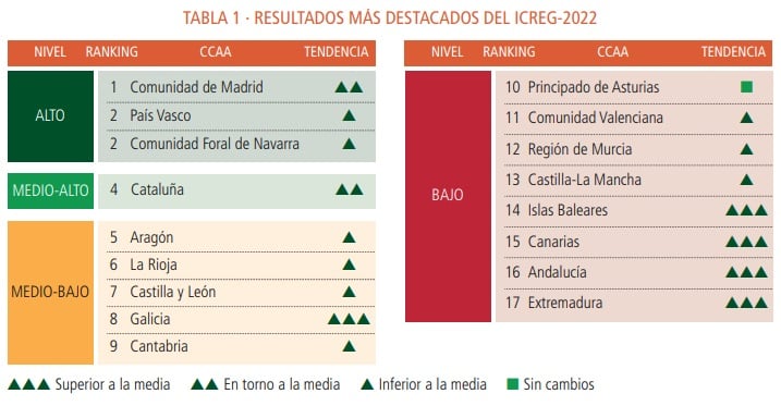 Con estas variaciones, la Comunidad de Madrid, País Vasco y Navarra siguen formando lo que los responsables del informe denominan «triángulo competitivo», por delante de Cataluña, que se mantiene como única integrante del nivel de competitividad medio-alto.