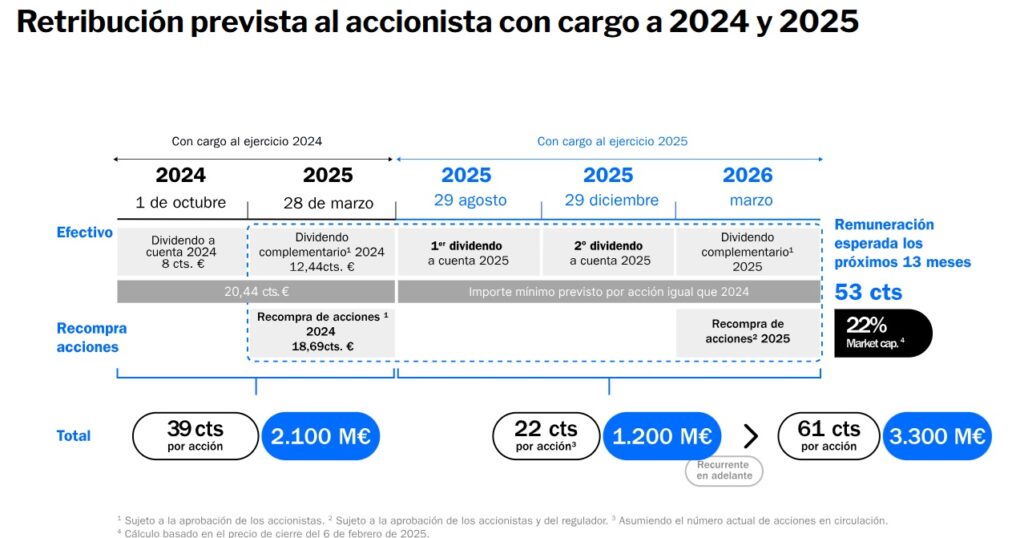 En paralelo al anuncio de las cifras de 2024, que reflejan unas ganancias un 37,1 % mayores que en el ejercicio anterior, el banco someterá a la aprobación de la junta de accionistas una retribución de 53 céntimos de euro por título.