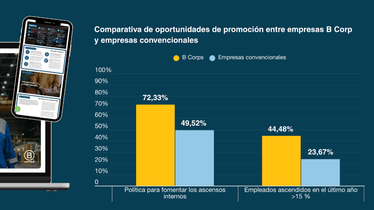 - Crecimiento profesional y formación. La apuesta por el talento es casi universal en la comunidad B Corp: el 99% de las B Corps ofrece formación a las nuevas incorporaciones y el 96% proporciona programas de capacitación basados en competencias. Estas empresas también duplican la promoción interna frente al tejido empresarial general: el 44% ha ascendido a más del 15% de su plantilla, frente al 23% de las empresas convencionales.